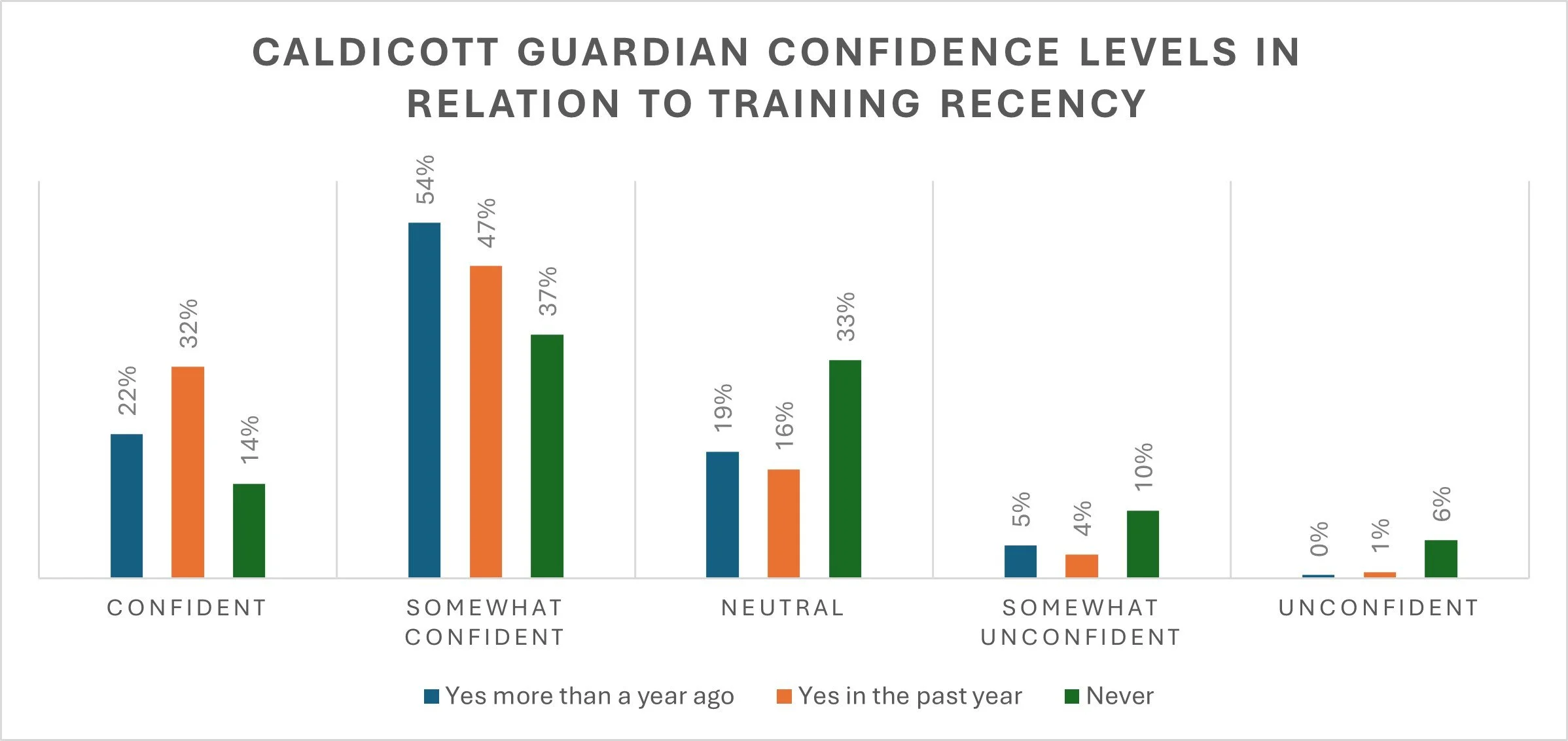 Confidence varies and is closely linked to training: While most respondents feel confident (22%) or somewhat confident (46%) in their role, lower confidence levels are more common among those who are newer to the role or who have never received formal Caldicott Guardian training. Nearly one-third of respondents reported never having had professional development related to their role.
