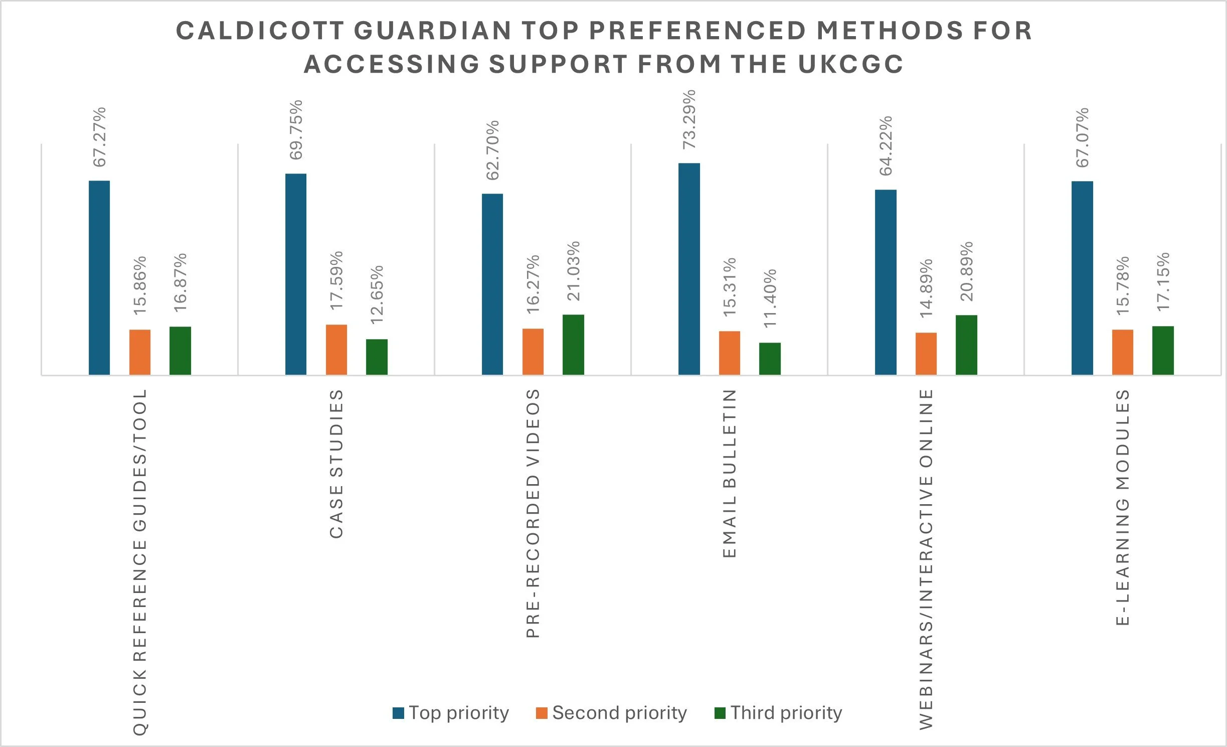 Strong demand for practical, accessible support: Professional development (33%), answers to specific queries (18%), and guidance and written notes (17%) were ranked as the most useful forms of support from the UKCGC. Furthermore, quick reference guides, elearning modules, webinars, and case studies were consistently ranked as the most helpful ways to access support.